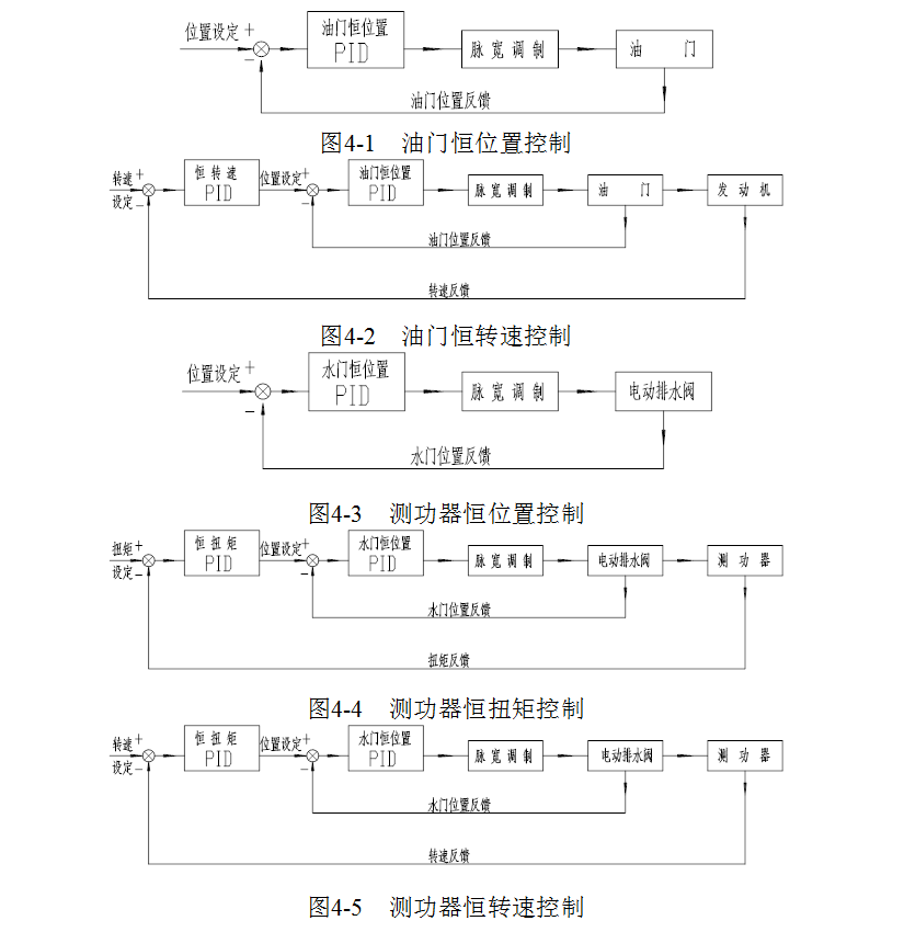 2.2.1 負荷測量 測功器吸收的負荷通過測功器連桿傳到拉壓傳感器上,當傳感器得到正常的供給電源時,在測功器外殼的作用下,傳感器就會有微弱的電信號輸出,該信號與傳感器所受的外力成正比。通過高精度直流放大器放大后經(jīng)A/D轉(zhuǎn)換,轉(zhuǎn)換成相應的負荷數(shù)字信號。 2.2.2 溫度測量 Pt100熱電阻或K分度熱電偶等溫度傳感器能產(chǎn)生與溫度成一定比例的電壓信號,該信號經(jīng)高精度直流放大器放大后,做A/D轉(zhuǎn)換得到相應溫度的數(shù)字信號。 2.2.3 壓力測量 壓力變送器在得到正常的工作電源時,產(chǎn)生與被測壓力成正比的電流信號,由電流/電壓轉(zhuǎn)換電路轉(zhuǎn)換成電壓信號, 該信號經(jīng)高精度直流放大后,做A/D轉(zhuǎn)換產(chǎn)生相應的壓力數(shù)字信號。 2.2.4 油門和水門位置反饋 油門和水門執(zhí)行器產(chǎn)生與其位置開度值成正比的電壓信號,反饋至高精度直流放大器放大后,做A/D轉(zhuǎn)換,產(chǎn)生與油門和水門開度值成比例的數(shù)字信號。 轉(zhuǎn)速、負荷的測量信號,一方面作為測量參數(shù),經(jīng)相關(guān)數(shù)值運算和處理后,送顯示和通信輸出;另一方面,作為受控參數(shù),將以反饋信號的形式參與控制運算。 2.3 油耗測量 油耗測量采用獨立的結(jié)構(gòu),油耗測量儀與上位機之間通過CAN總線或232串行接口進行數(shù)據(jù)通信,實現(xiàn)測量結(jié)果和控制信號的相互傳輸, NCK2000控制油耗儀啟動或停止測量,同時接收油耗儀的測量數(shù)據(jù),將油耗測量結(jié)果經(jīng)處理后,供顯示、打印和通信輸出。油耗測量原理請參閱《HZB2000油耗測量儀用戶手冊》。 3. 計算 轉(zhuǎn)速、負荷、油耗等測量參數(shù)經(jīng)相應數(shù)據(jù)處理后,得到扭矩、功率、油耗率等測量結(jié)果,其計算公式為: 扭矩: Me=0.9549*W Me—扭矩(N·m) W—負荷(N) 功率: Pe=n*W/10000 Pe—功率(kw) n—轉(zhuǎn)速(r/min) W—負荷(N) 油耗量: Gf=(ΔG/Δt)*3.6 Gf—油耗量(kg/h) ΔG—油耗質(zhì)量(g) Δt—油耗時間(s) 油耗率: Ge=(Gf/Pe)*1000 Ge=油耗率(g/kw.h) Gf—油耗量(kg/h) Pe—功率(kw) 4. 控制 NCK2000系統(tǒng)以雙回路數(shù)字調(diào)節(jié)器為核心,配以油門執(zhí)行器和水門執(zhí)行器等功能部件,綜合轉(zhuǎn)速、扭矩、油門和水門位置反饋等測量信號,實現(xiàn)計算機數(shù)字控制??刂苹芈贩譃橛烷T控制回路和測功器控制回路,其中油門控制回路有油門恒位置控制和恒轉(zhuǎn)速控制兩種方式。測功器控制回路有測功器恒位置控制、恒扭矩控制、平方特征控制、恒轉(zhuǎn)速控制四種方式,其控制原理分別如圖4-1至4-5。